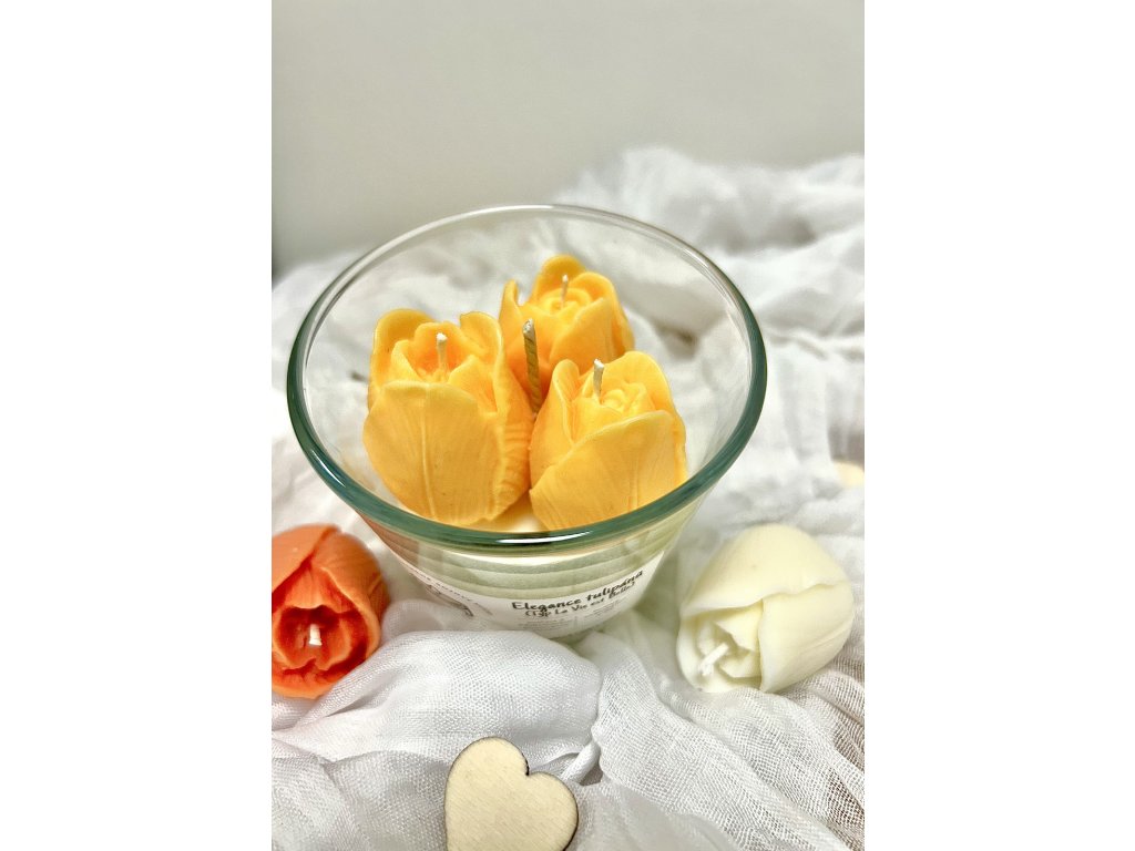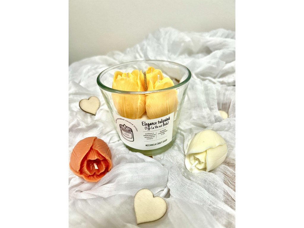 Sójová svíčka ve skle s elegantní vůni perfému La vie est belle s motivem tulipánů.